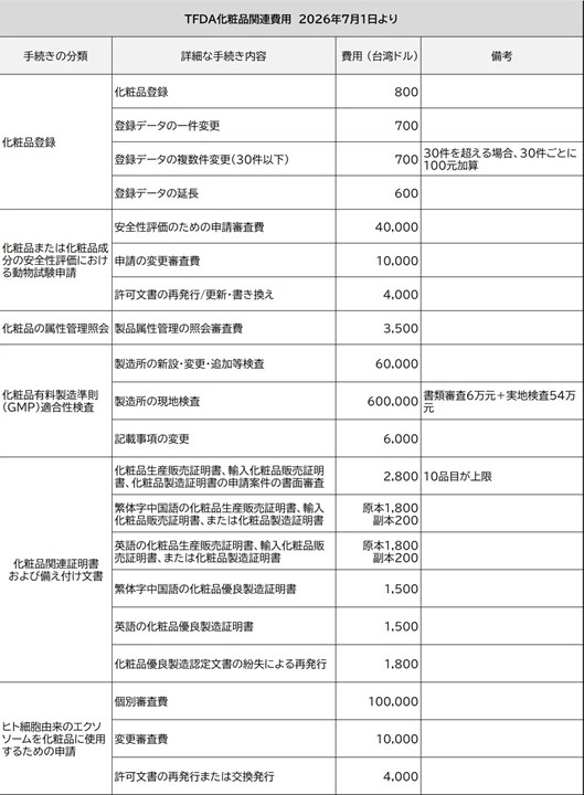 日本語訳:「化粧品行政規費徴収標準」の修正。(中華民国115年(2026年)7月1日より施行https://www.fda.gov.tw/TC/newsContent.aspx?cid=3&id=31286